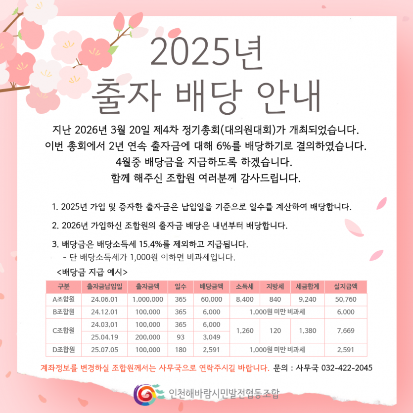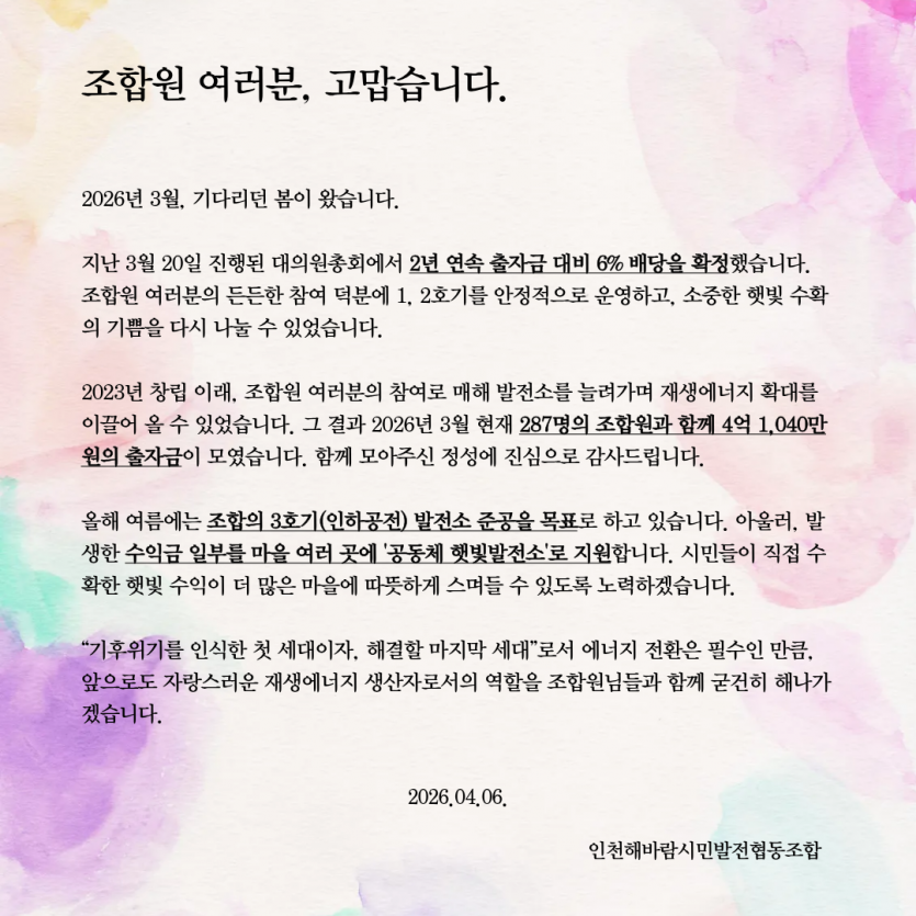 지난 3월 20일 진행된 정기총회 결과, 조합원님들의 든든한 지지와 참여 덕분에 지난해에 이어 **'2년 연속 출자금 대비 6% 배당'**이 확정되었습니다! 2023년 창립 이래 287명의 조합원님과 4억 1,040만 원의 출자금이 모여, 올여름 3호기(인하공전) 준공을 앞두고 있습니다. 또한 수확한 햇빛 수익금 일부를 마을 곳곳에 '공동체 햇빛발전소'로 지원하여 따뜻한 선순환을 이어갑니다. 기후위기 시대, 자랑스러운 재생에너지 생산자로서 에너지 전환에 함께해 주셔서 진심으로 감사합니다. 확정된 배당금 지급 일정을 아래와 같이 안내해 드립니다. 조합원님, 2026년 3월 기다리던 봄과 함께 기분 좋은 소식을 전해드립니다. 지난 3월 20일 진행된 정기총회 결과, 조합원님들의 든든한 지지와 참여 덕분에 지난해에 이어 **'2년 연속 출자금 대비 6% 배당'**이 확정되었습니다! 2023년 창립 이래 287명의 조합원님과 4억 1,040만 원의 출자금이 모여, 올여름 3호기(인하공전) 준공을 앞두고 있습니다. 또한 수확한 햇빛 수익금 일부를 마을 곳곳에 '공동체 햇빛발전소'로 지원하여 따뜻한 선순환을 이어갑니다. 기후위기 시대, 자랑스러운 재생에너지 생산자로서 에너지 전환에 함께해 주셔서 진심으로 감사합니다. 확정된 배당금 지급 일정을 아래와 같이 안내해 드립니다. [ 2025년 배당금 지급 안내 ] ▶ 배당률: 출자금의 6% ▶ 배당 기준일: 2025년 12월 31일 기준 조합원 ▶ 지급 예정일: 2026년 4월 중 ▶ 입금 계좌: 조합 가입 시 등록하신 본인 명의 계좌 [ 안내 및 유의사항 ] 관련 법령에 따라 배당소득세(15.4%)가 원천징수된 후 지급됩니다. 가입 시 등록하신 계좌번호가 변경되셨거나, 지급일 이후 입금 확인이 안 되시는 분은 사무국으로 연락 바랍니다. ■ 문의: 인천해바람시민발전 사무국 (☎ 032-422-2045) 앞으로도 공동체를 살리는 따뜻한 햇빛 에너지를 나누는 데 앞장서겠습니다. 늘 건강하시고 평안한 봄날 보내시길 바랍니다!