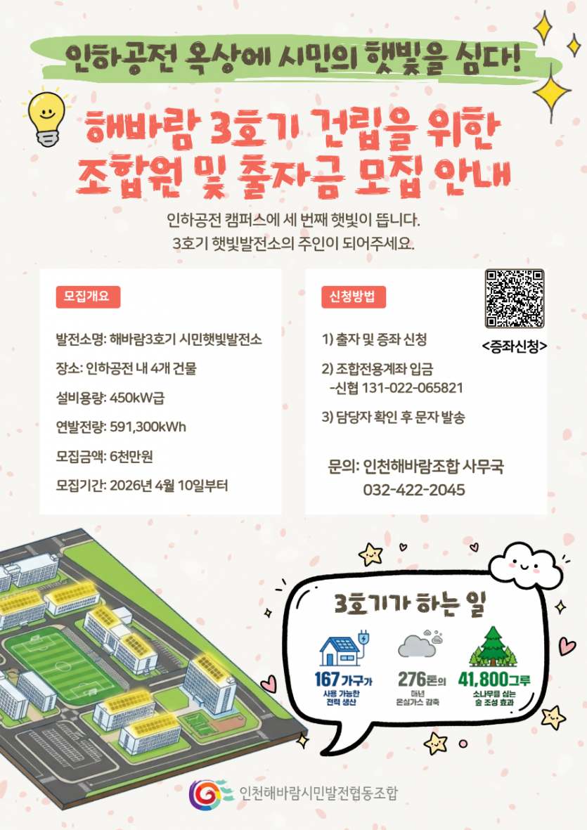 인하공전 내 4개 건물 옥상에 지어질 '해바람 3호기 시민햇빛발전소'의 주인이 되어주실 조합원 및 출자금을 모집합니다. ■ 해바람 3호기 사업 개요 발전소명: 해바람 3호기 시민햇빛발전소 설치 장소: 인하공전 내 4개 건물 옥상 설비 용량: 450kW급 연 발전량: 591,300kWh 모집 금액: 6,000만 원 (선착순 마감) 모집 기간: 2026년 4월 10일부터 ~ ■ 3호기가 하는 일 전력 생산: 약 167가구가 1년간 사용할 수 있는 청정 전기 생산 탄소 감축: 매년 276톤의 온실가스(CO2) 배출 감축 숲 조성: 30년생 소나무 41,800그루를 심는 것과 같은 공기정화 효과 ■ 출자 안내 및 기대 수익 출자 금액: 1구좌 당 100,000원 (부담 없는 소액으로 누구나 발전소 주인이 될 수 있습니다!) 예상 수익: 연 6% 배당 지급 예상 (최근 2년 조합 총회 지급 기준) 조합 전용 계좌 입금: 신청서 작성 후, 아래 계좌로 출자금을 입금해 주세요. 신협 131-022-065821 (예금주: 인천해바람시민발전협동조합) 담당자 확인: 입금이 완료되면 사무국에서 확인 후 안내 문자를 발송해 드립니다. ※ 아직 조합원이 아니신가요? 신규 조합원 가입 후 즉시 출자 참여가 가능합니다! 여러분의 작은 출자가 모여 인천의 맑은 하늘을 만듭니다. 지금 바로 해바람 3호기의 주인이 되어주세요!