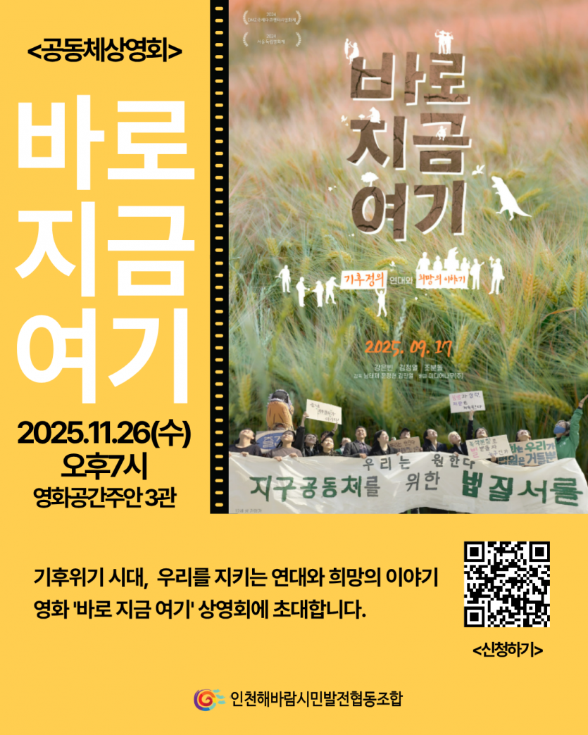이 영화는 기후정의를 위해 우리가 '바로 지금 여기'에서 할 수 있는 일들과, 그 과정에서 피어나는 '연대와 희망의 이야기'를 담고 있습니다. 조합원 여러분은 물론, 기후위기 문제에 관심 있는 인천시민이라면 누구나 환영합니다. 깊어가는 가을밤, 영화를 통해 따뜻한 공감과 희망을 나누는 자리에 함께해 주세요. [ 행사 개요 ] 행사명 : 영화 <바로 지금 여기> 공동체 상영회 일시 : 2025년 11월 26일 (수) 오후 7시 장소 : 영화공간주안 3관 대상 : 조합원 및 기후정의에 관심 있는 인천시민 누구나 주최/주관 : 인천해바람시민발전협동조합 [ 신청 안내 ] 참여를 원하시는 분은 아래 신청 링크를 통해 사전 신청을 완료해 주시기 바랍니다. 여러분의 많은 관심과 참여를 부탁드립니다. 감사합니다. [ 영화 정보 ] - 기획의도 - 기후위기는 먼 지역이나 미래의 일이 아니라 바로 오늘날 이 땅을 살아가는 민중들의 삶을 위협하는 '바로 지금 여기'의 일이라는 것을 보여 주고자 했다. 아울러 우리는 이 위기 속에서 어떻게 살아가야 할지 그리고 이 위기를 극복하기 위해 무엇을 해야 하는지에 대한 질문을 던지고 그 해답을 모색하고자 했다. 시민들에게 기후정의를 인식하는 계기를 마련해 주는 영화를 만들고 싶었다. - 줄거리 - 석탄발전소를 수출하는 기업 본사에서 시위를 벌였다는 이유로 기소되어 법정 투쟁을 시작한 은빈은 법정에서 기후위기의 절박함과 민중들이 겪는 기후재난 이야기를 시작한다. 은빈의 이야기는 쪽방촌과 농촌의 기후재난 현장으로 이어지고 기후재난의 현실 속에서 돌봄과 공동체의 힘으로 삶을 지켜 나가는 민중들의 이야기가 펼쳐진다. 청년 은빈은 치열한 싸움 속에서 대법원 선고를 맞이한다. - 감독소개 - 남태제 다큐멘터리영화<월성>(2019) <학교>(2003)연출 문정현 다큐멘터리영화<붕괴>(2014) <할매꽃>(2007)연출 김진열 다큐멘터리영화<왕십리김종분>(2021) <나쁜나라>(2015)연출 - 러닝타임 : 94분 - 관련링크