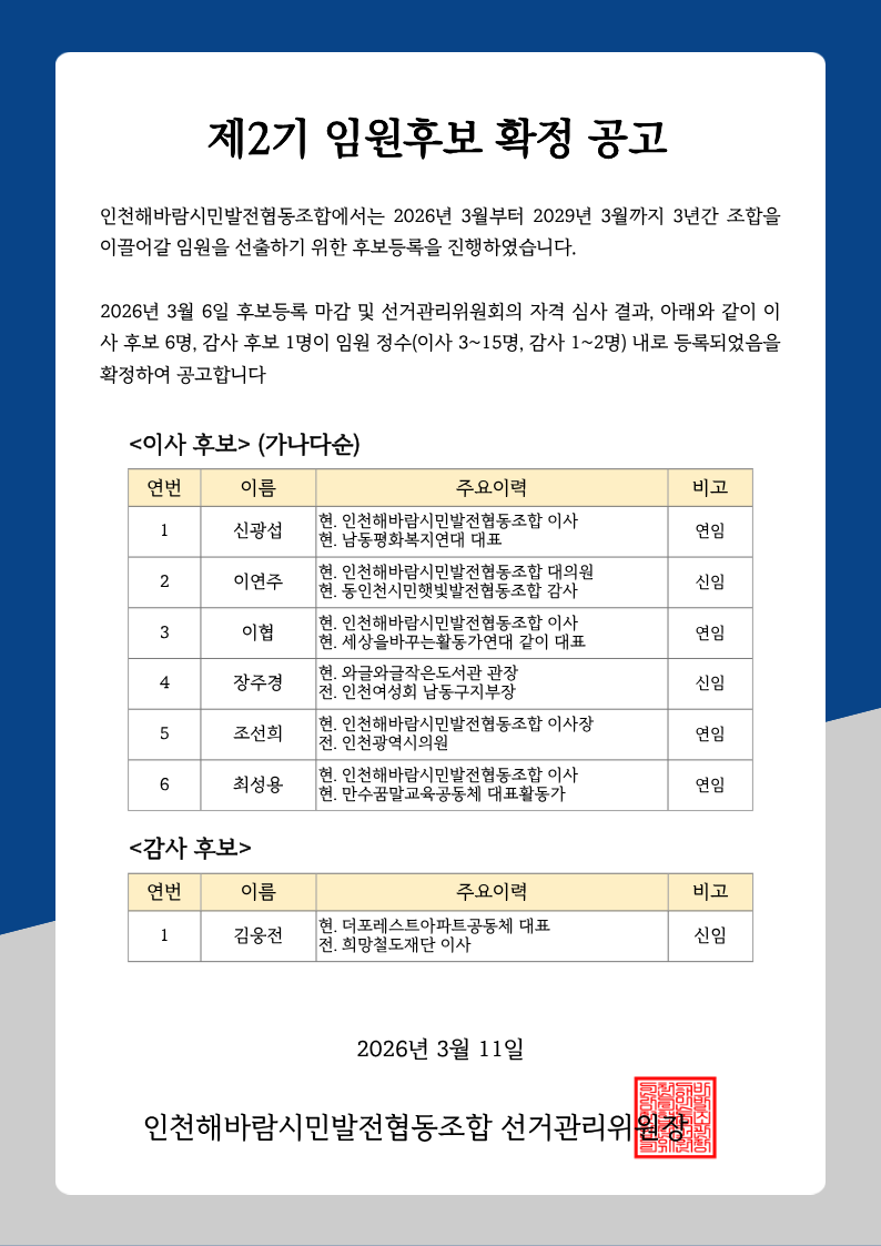 | 2 | 이연주 | 현. 인천해바람시민발전협동조합 대의원 현. 동인천시민햇빛발전협동조합 감사 |